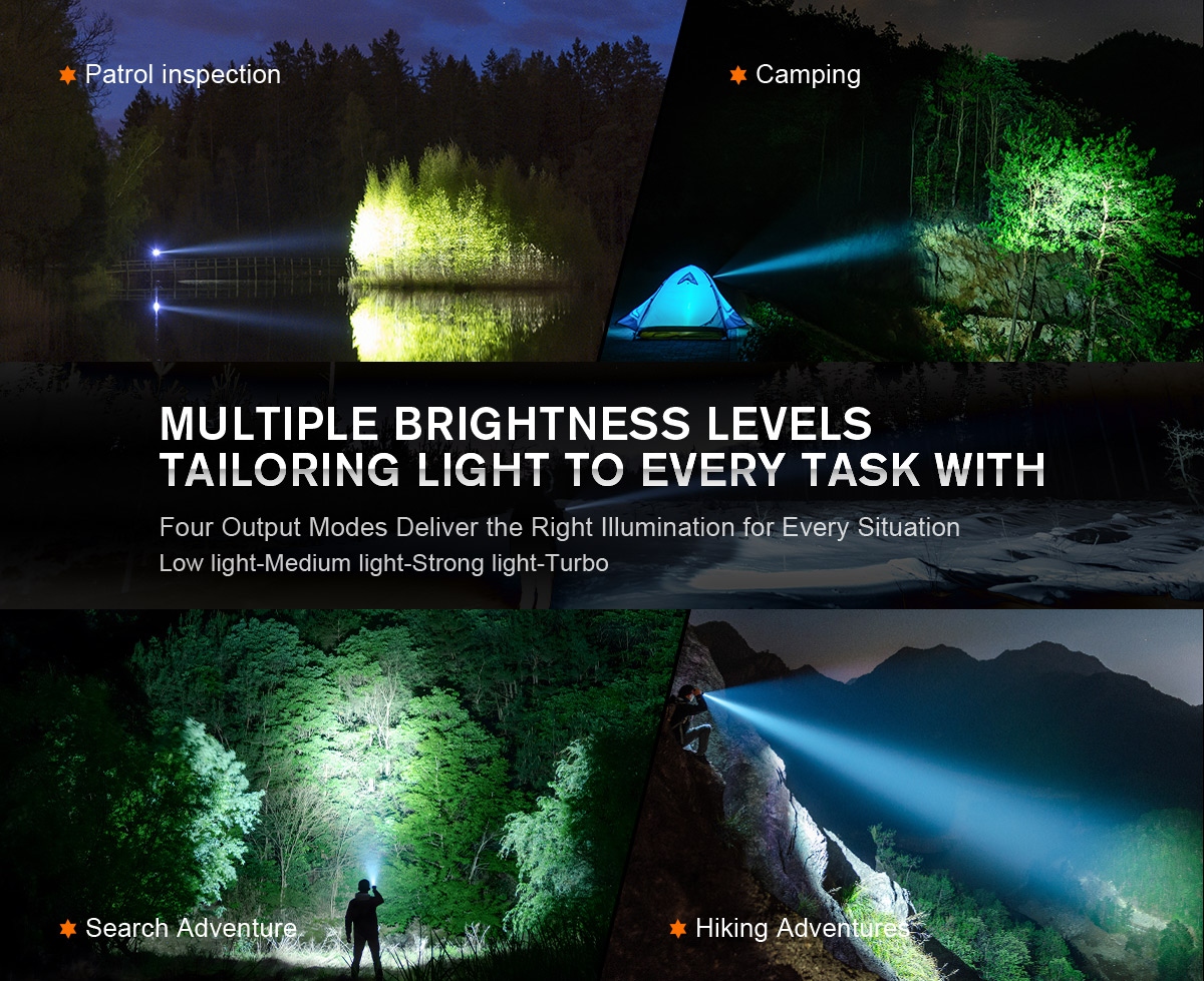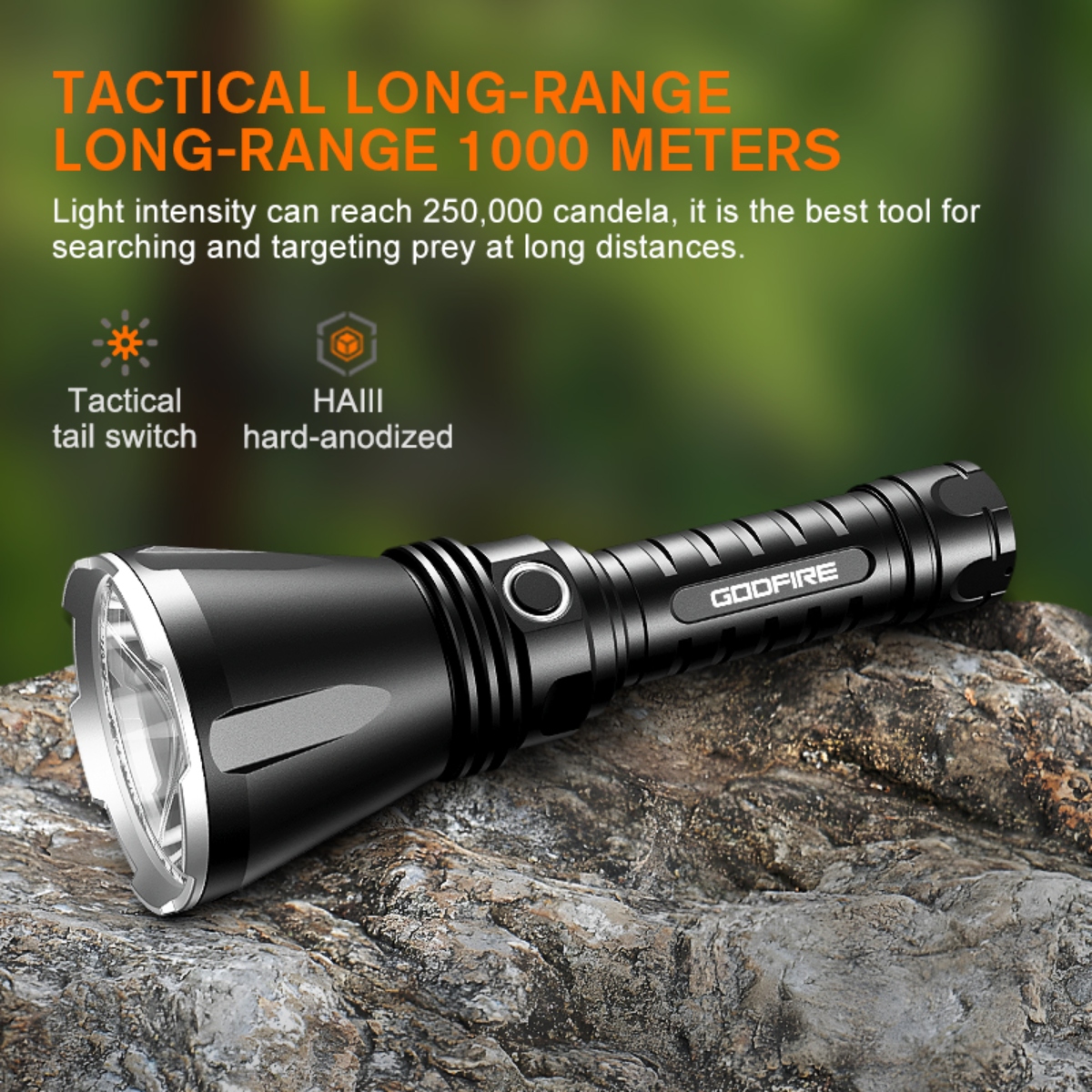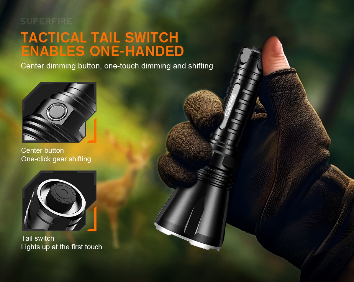 Enter the GODFIRE TF01, the inaugural masterpiece of SUPERFIRE's high-end product series. Equipped with cutting-edge OSRAM long-range lamp beads and a sizable metal reflector, this flashlight boasts a remarkable beam throw of up to 1000 meters. The TF01 is engineered for seamless operation, featuring a classic tactical tail switch for instant illumination with the touch of a button. Additionally, a center-mounted dimmer button enables convenient one-handed operation, allowing users to adjust brightness levels and switch between modes effortlessly. Crafted with the utmost attention to durability, the TF01 undergoes a rigorous hard anodizing process to enhance its surface hardness and wear resistance. This ensures that it remains resilient against the elements, from rain and dust to the inevitable bumps and scrapes encountered during outdoor pursuits. Furthermore, its aluminum alloy construction offers superior strength without compromising on portability. With an impressive output of 1371 lumens and a maximum beam distance of 1000 meters, the TF01 delivers unparalleled brightness and clarity, allowing you to navigate the darkness with confidence. Rated at IP55 waterproof, it defies the elements with ease, ensuring reliable performance even in the harshest weather conditions. The inclusion of a standard 4800mAh battery ensures extended runtime, lasting up to an impressive 52 hours on a single charge. This not only reduces environmental impact but also guarantees uninterrupted illumination when you need it most. Whether you're a seasoned outdoor enthusiast, a dedicated hunter, or an emergency responder, the TF01 stands ready to illuminate your path and empower your adventures.