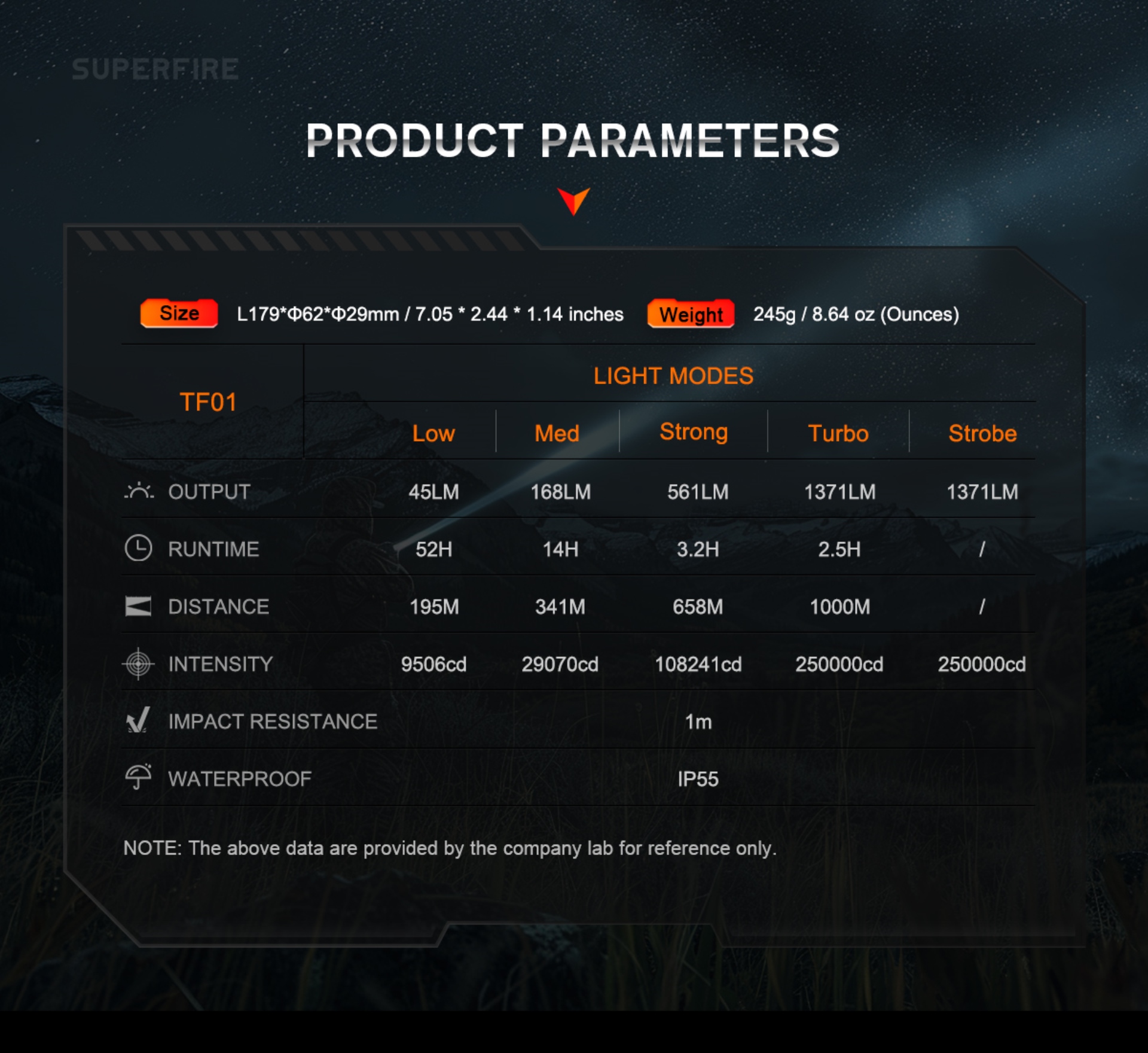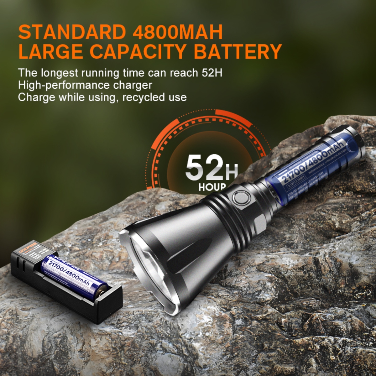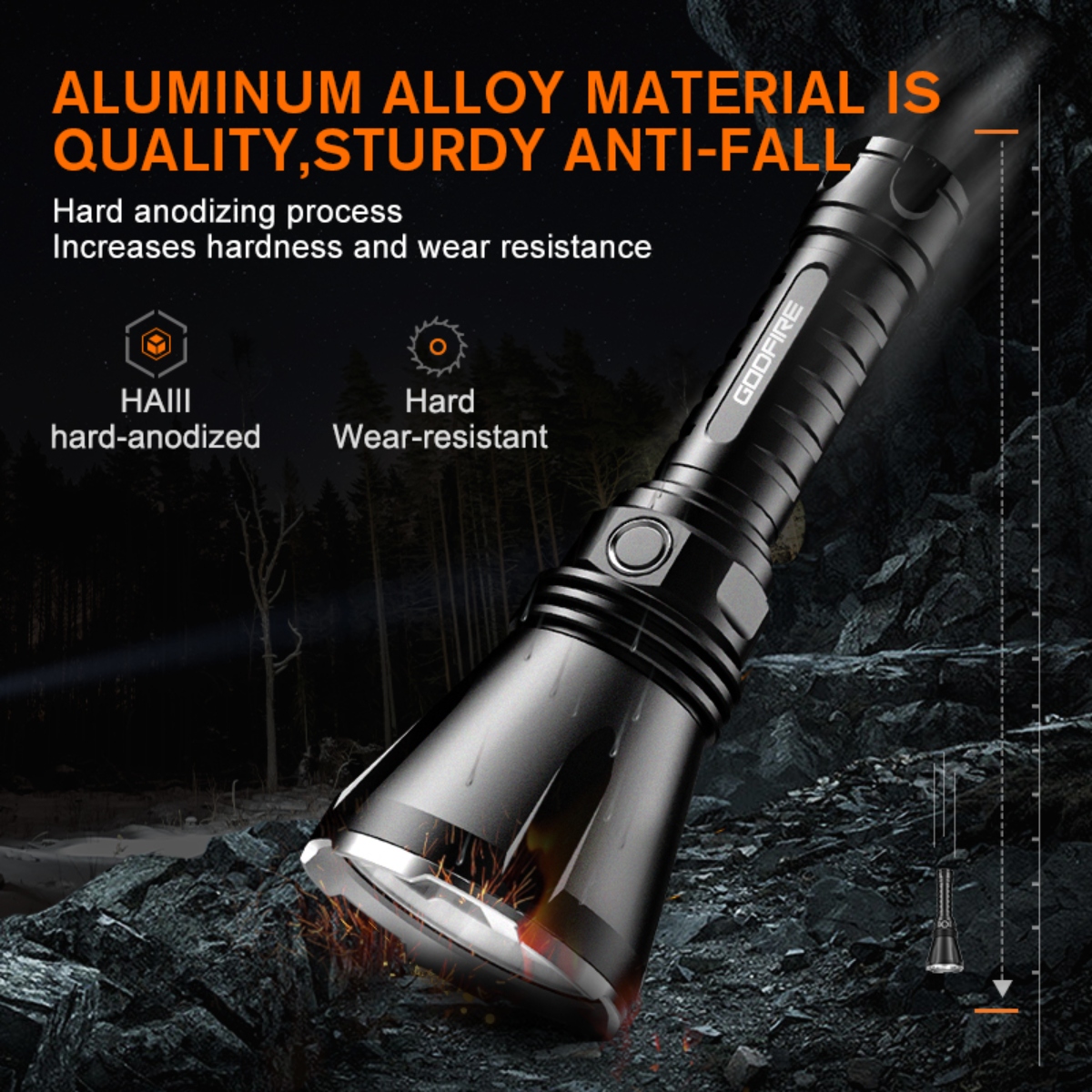 Enter the GODFIRE TF01, the inaugural masterpiece of SUPERFIRE's high-end product series. Equipped with cutting-edge OSRAM long-range lamp beads and a sizable metal reflector, this flashlight boasts a remarkable beam throw of up to 1000 meters. The TF01 is engineered for seamless operation, featuring a classic tactical tail switch for instant illumination with the touch of a button. Additionally, a center-mounted dimmer button enables convenient one-handed operation, allowing users to adjust brightness levels and switch between modes effortlessly. Crafted with the utmost attention to durability, the TF01 undergoes a rigorous hard anodizing process to enhance its surface hardness and wear resistance. This ensures that it remains resilient against the elements, from rain and dust to the inevitable bumps and scrapes encountered during outdoor pursuits. Furthermore, its aluminum alloy construction offers superior strength without compromising on portability. With an impressive output of 1371 lumens and a maximum beam distance of 1000 meters, the TF01 delivers unparalleled brightness and clarity, allowing you to navigate the darkness with confidence. Rated at IP55 waterproof, it defies the elements with ease, ensuring reliable performance even in the harshest weather conditions. The inclusion of a standard 4800mAh battery ensures extended runtime, lasting up to an impressive 52 hours on a single charge. This not only reduces environmental impact but also guarantees uninterrupted illumination when you need it most. Whether you're a seasoned outdoor enthusiast, a dedicated hunter, or an emergency responder, the TF01 stands ready to illuminate your path and empower your adventures.