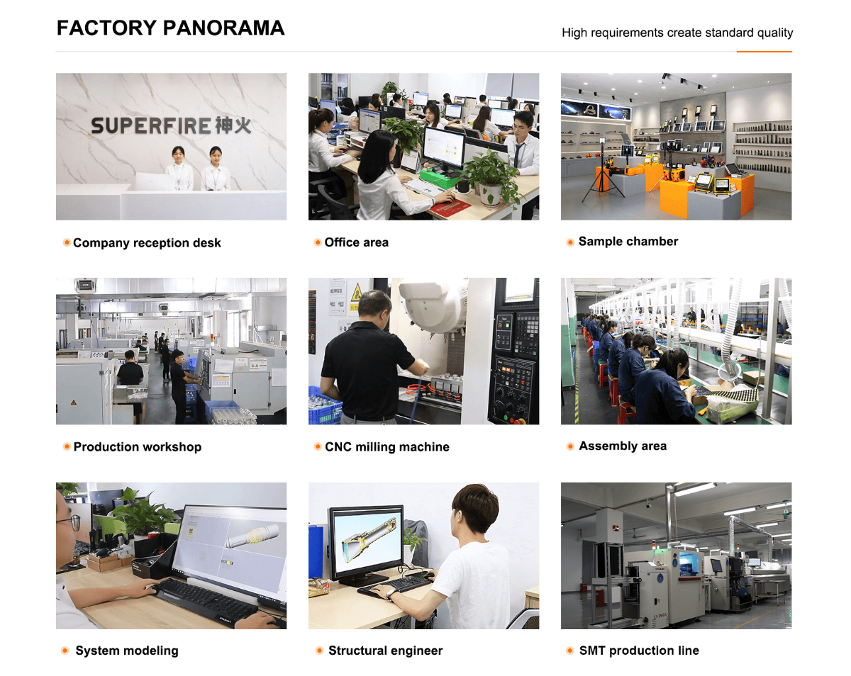 Located in Shenzhen, China, Superfire covers an area of 4,500 square meters and has 300 employees. With advanced production equipment and strong R&D capability, we can guarantee all our products are strictly made, performance-tested and inspected. We are a fully verified factory with CE certification, ISO9001 certification, FCC certification, and ROHS certification. Superfire brand is favored by customers all over the world, and has been the top seller in China for 5 consecutive years!