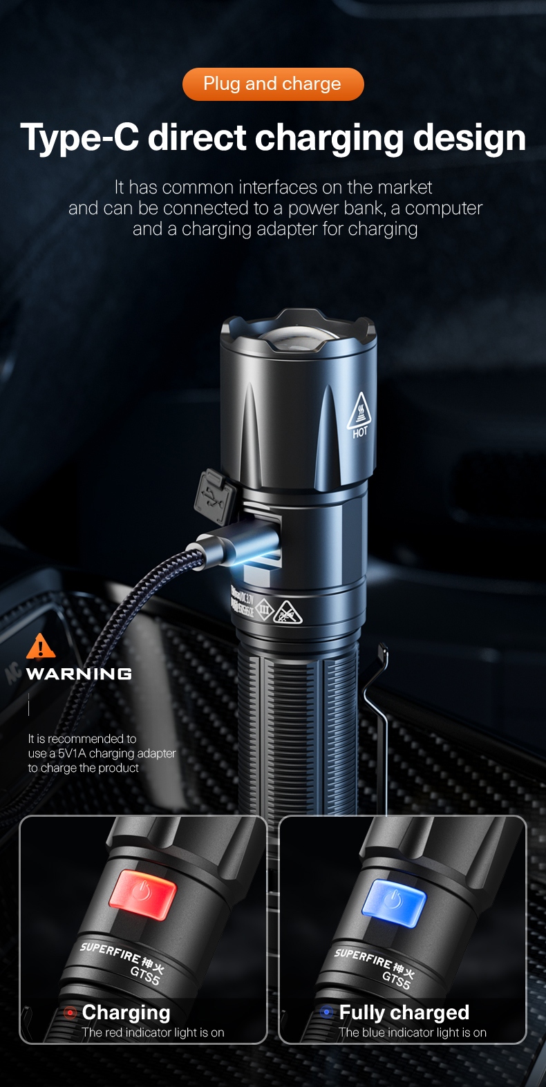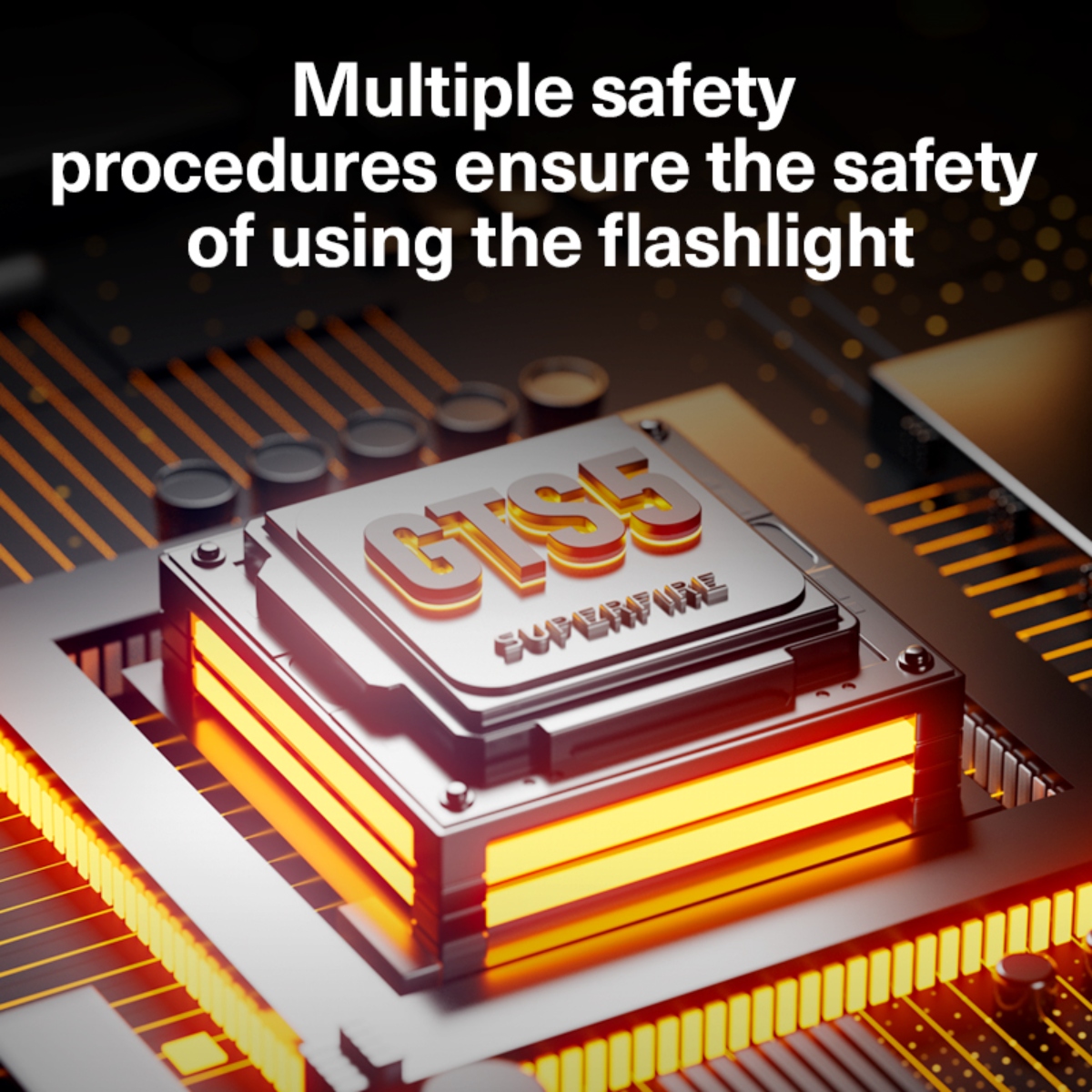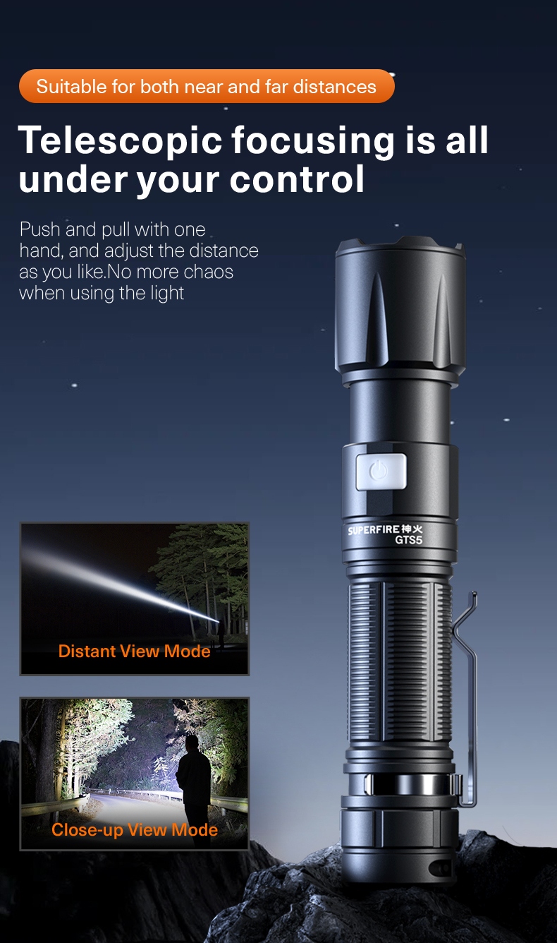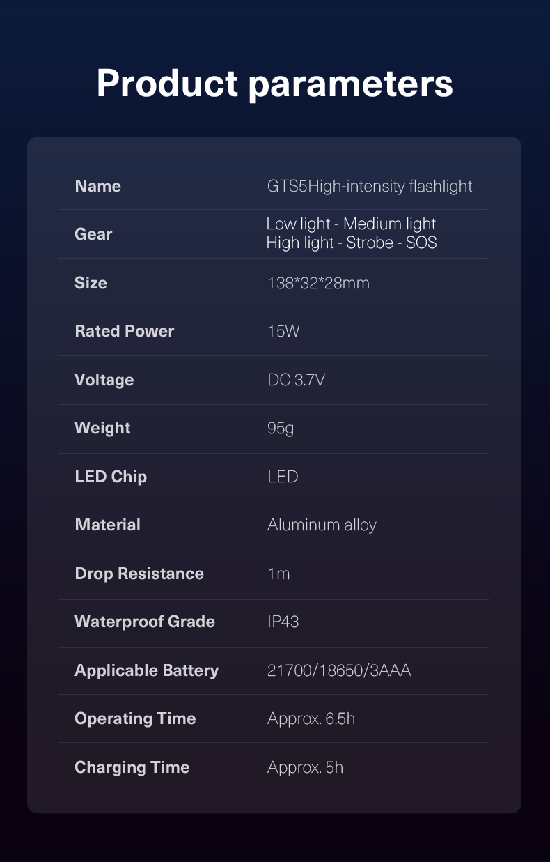 The GTS5 high-intensity flashlight combines power, durability, and convenience in a compact package. Its adjustable focus allows you to switch between a wide flood beam for area lighting and a focused spotlight for long-distance illumination. The five lighting modes cater to various situations, from everyday use to emergency scenarios. With its rugged construction, long battery life, and advanced safety features, the GTS5 is ready to accompany you on your toughest adventures or serve as a reliable tool for professional use.