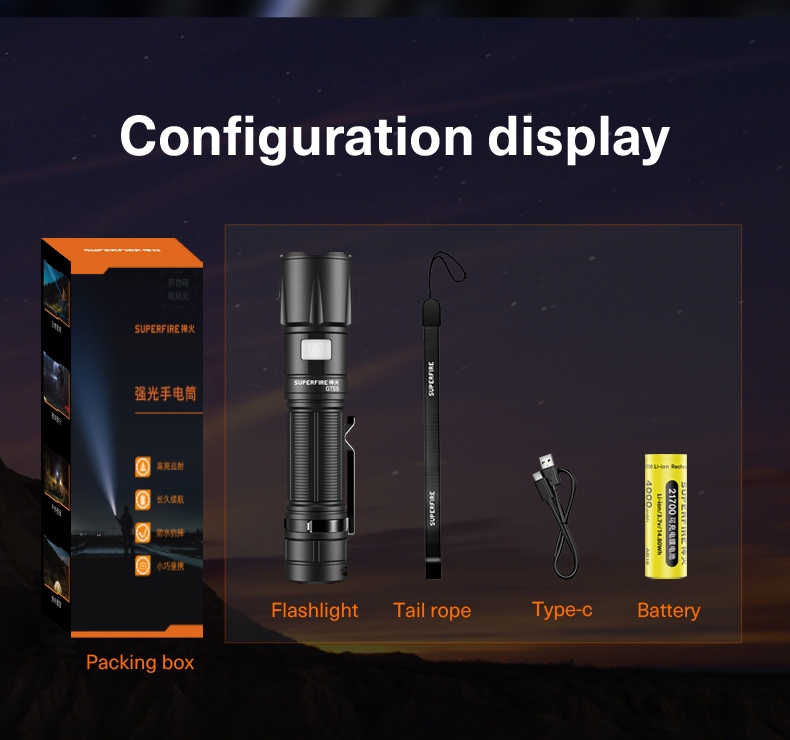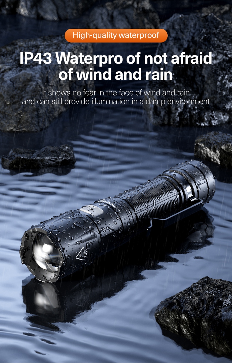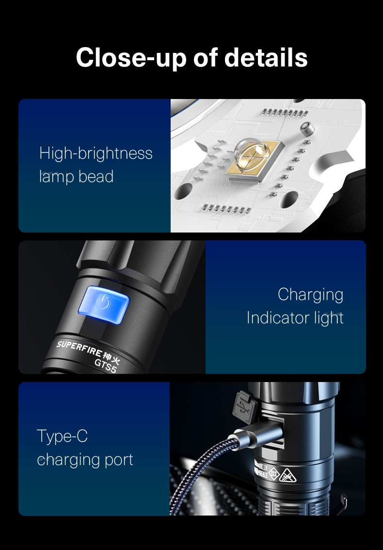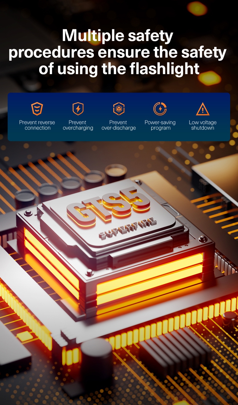 The GTS5 high-intensity flashlight combines power, durability, and convenience in a compact package. Its adjustable focus allows you to switch between a wide flood beam for area lighting and a focused spotlight for long-distance illumination. The five lighting modes cater to various situations, from everyday use to emergency scenarios. With its rugged construction, long battery life, and advanced safety features, the GTS5 is ready to accompany you on your toughest adventures or serve as a reliable tool for professional use.