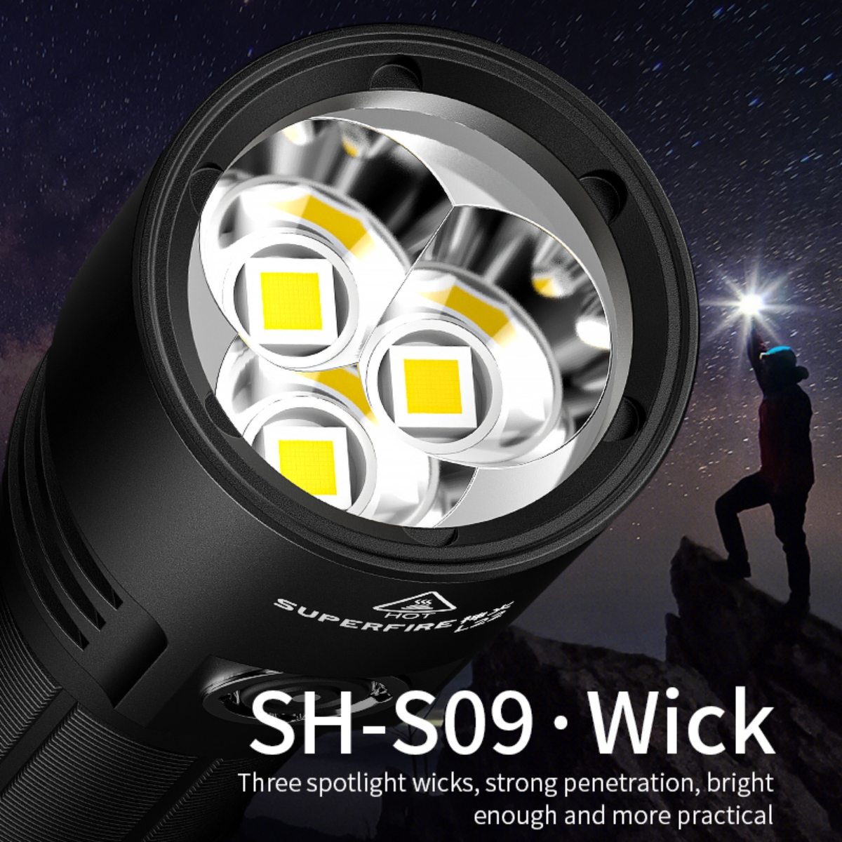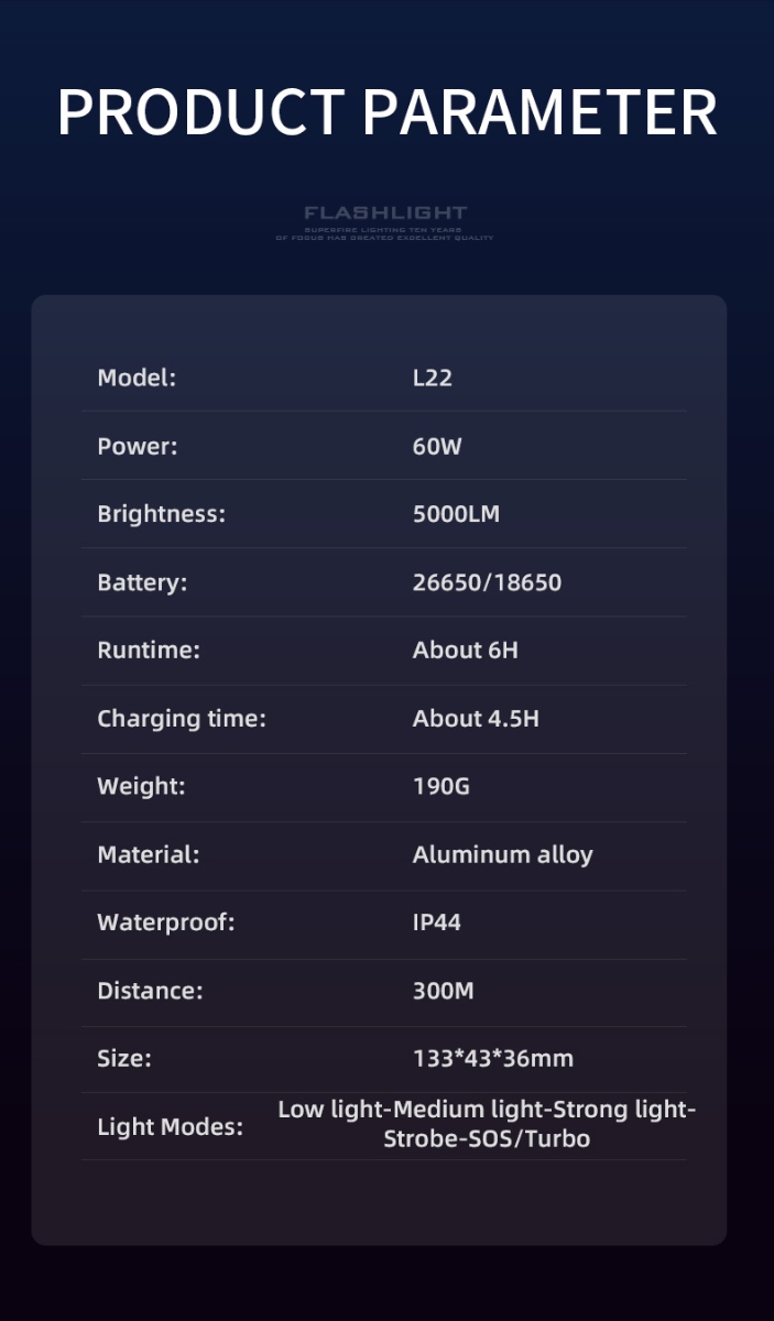 SUPERFIRE L22 is a powerful flashlight with up to 5000 lumens and multiple wicks to illuminate large areas or objects at a distance.Exquisite appearance, with hand strap, stylish and compact, easy to carry. External 26650, can be replaced at any time. It includes multiple lighting modes including high, medium, low, strobe and SOS to suit different situations. Made of durable materials such as aluminum alloy, making it impact-resistant and waterproof. This flashlight is often used in situations where strong light is needed, such as outdoor adventures, search and rescue operations, and even professional missions in low-light environments.
