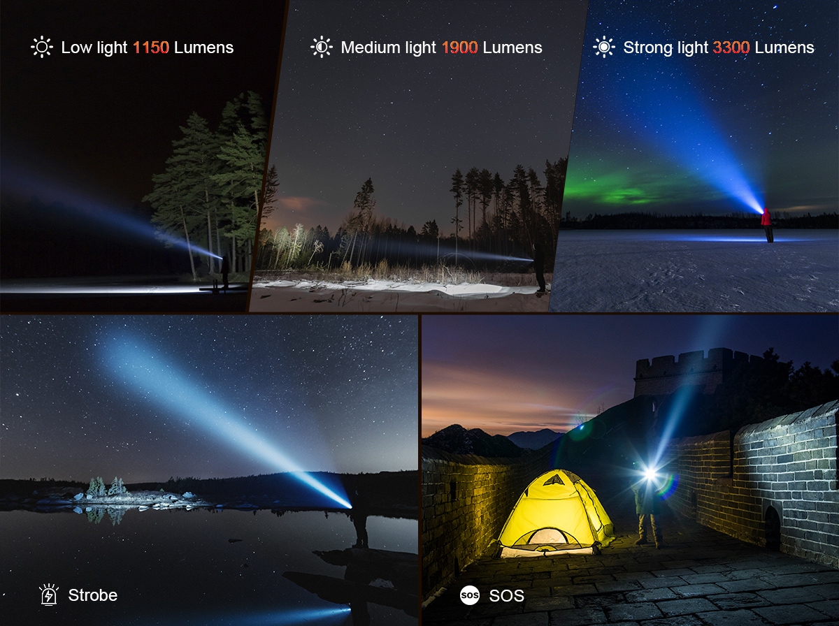 1. 5 lighting modes (Low/Medium/High/Strobe/SOS) for all scenarios; long-press (3s) to turn off in any mode.